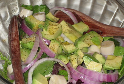 ingredients 2 C chopped romaine lettuce 1/2 avocado, cubed 1/4 red onion, chopped 1/4 C chopped palm hearts directions Toss it all and top with grilled chicken breast if desired. Dressing is unnecessary as...